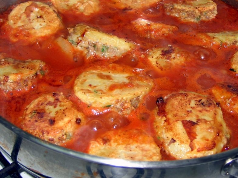 Очистите картофель и нарежьте его толстыми кружками толщиной в полтора-два сантиметра. Каждый кружок надрежьте сбоку почти до конца. Теперь смешайте фарш с тертым луком, одним яйцом, солью, перцем, корицей и размоченным хлебом. Начините кружочки картофеля фаршем, обваляйте в яйце, муке и обжарьте с двух сторон на сковороде. Теперь в кастрюлю нарежьте морковь, выложите картофель, залейте его водой с пастой и тушите полтора часа.