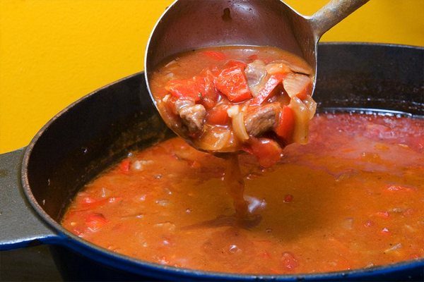 Мелко порежьте чеснок и перец чили. Немного обжарьте на сковороде, добавьте туда половину банки резаных томатов, перемешайте, влейте вино. Тушите острую ароматную смесь 10-15 минут. Не забывайте мешать пригоранию продуктов! Добавьте в суп томатно-винную смесь и ложку тмина. Картофель нарежьте кубиками и отправляйте туда же. Теперь пусть все еще немного покипит (минут 30). Попробуйте, достаточно ли мягкое получилось мясо (по идее оно не должно развариться, и зубы для поедания супа вам очень даже пригодятся). С другой стороны, мало ли какие у вас потребности: если вам пока слишком жестко, пусть томление супа продолжится до нужной вам консистенции мяса.