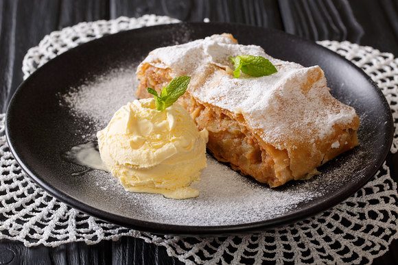 Режем 6–8 груш тонкими ломтиками, пересыпаем 100 г сахара с 2 ч. л. корицы и щепоткой мускатного ореха. Посыпаем чистое полотенце мукой и прямо на нем раскатываем тесто в тончайший пласт. Смазываем его растопленным сливочным маслом, выкладываем начинку, посыпаем 100 г изюма и 100 г молотых сухарей. С помощью полотенца скатываем рулет, укладываем на противень, смазываем взбитым желтком и ставим в духовку при 180°C на 40 минут. Утонченным дополнением к теплому грушевому штруделю станет сливочное мороженое.