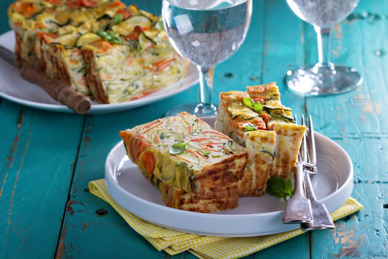 Нарежь морковку и цуккини на тонюсенькие ломтики, раздави три зубчика чеснока и обжарь все на оливковом масле. Смешай молоко и яйца, посоли и поперчи, добавь базилик. А теперь просто смещай в форме хлеб, яично-молочную смесь и обжаренные овощи и запекай 30 минут при температуре 200С.