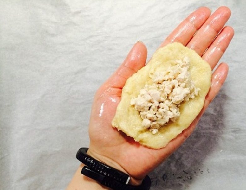 Помести в каждую лепешку небольшое количество фарша и аккуратно соедини края пирожка. Обжаривай изделия на подсолнечном масле до румяной корочки.