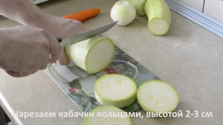 Для начала нарезаем кабачки кольцами, высота кольца примерно 2-3 см. Из середины кольца вырезаем сердцевину.