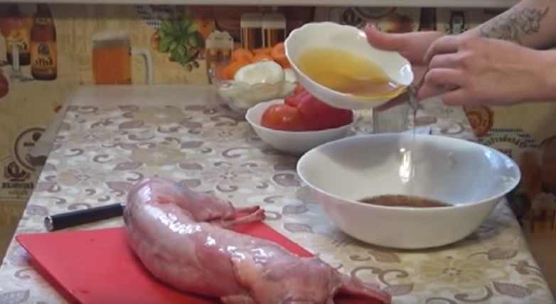Очисти и промой тушку кролика. Приготовь маринад, смешивая ингредиенты в той последовательности, в какой они указаны.