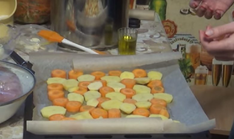 Укрой противень бумагой для выпекания и выложи слоями нарезанные овощи. Сначала морковь, затем картофель, далее лук. Каждый слой посоли, поперчи и полей оливковым маслом.