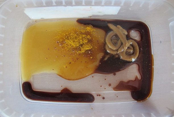 Приготовим маринад: соединить и слегка взбить вилкой соевый соус, мёд, растительное масло, горчицу и по щепотке соли и карри.