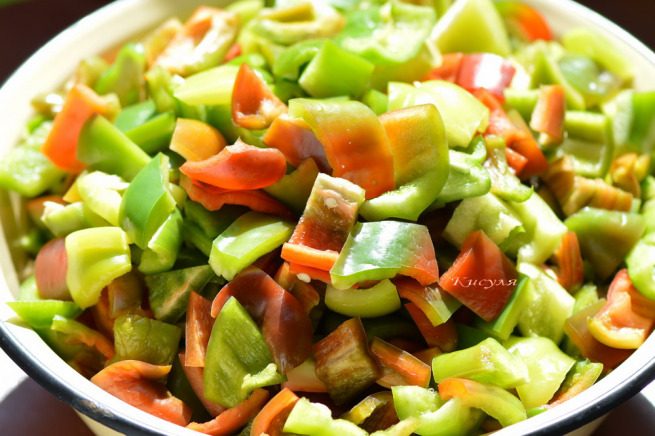 Перцы очистить от плодоножек и сердцевины, нарезать небольшими кусочками.