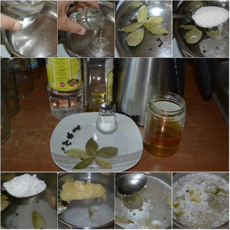 Залей 0,5 л воды в кастрюльку, затем добавь всё по списку: уксус, лавровый лист, черный и душистый перец, гвоздику, соль, сахар, мёд и растительное масло. Доведи рассол до кипения и оставь его остывать.