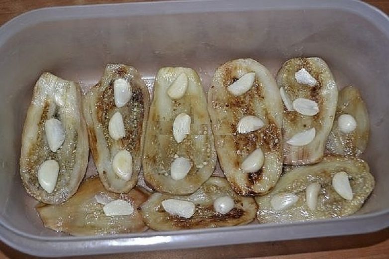 Когда баклажаны остынут, сложи их в емкость для хранения. Как на фото: берешь одну пластинку баклажана, обмакиваешь в рассол и укладываешь в лоток. Укладывать баклажаны для маринования нужно поплотнее. Выложи первый ряд, на каждый кусочек положи 2–3 дольки нарезанного чеснока. Сверху уложи еще ряд баклажанов и опять чеснок. Выложи таким образом все баклажаны и подготовленный чеснок. По желанию чеснока можно добавить меньше.