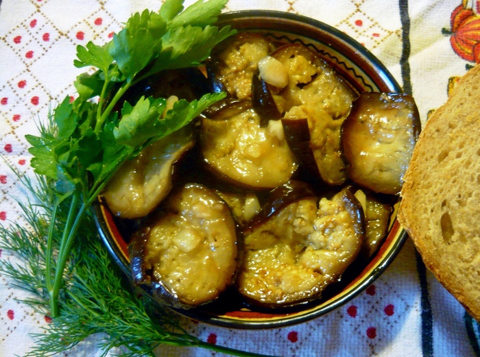 такой простой рецепт!? Делали всегда не мудрствуя лукаво: обжаривали ломтики баклажан, укладывали в посуду, пересыпали рубленной зеленью (каждый брал зелень по-своему вкусу), чесноком и сбрызгивали каждый слой либо винным (яблочным) уксусом или лимонным соком, давали блюду (закуске) постоять, настояться, пропитаться и было гораздо вкуснее и быстрее предложенного.