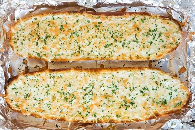 6. Выньте противень из духовки, откройте фольгу и заверните ее вовнутрь. Посыпьте хлеб равномерно сыром.