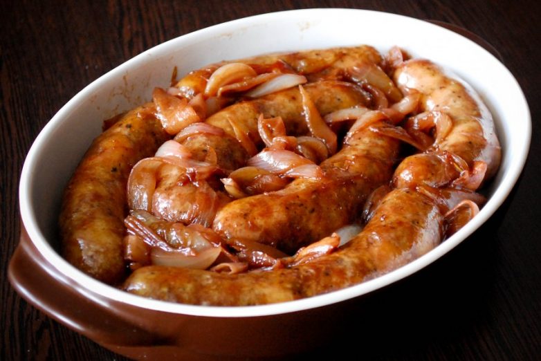 Свиные колбаски в соусе из лука с вином.