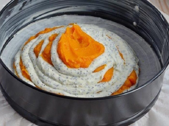 Застели дно формы (лучше всего использовать разъемную) пекарской бумагой и смажь маслом. Бортики смажь тоже маслом и посыпь небольшим количеством муки. Поочередно выкладывай по ложке творожной массы и тыквенной.