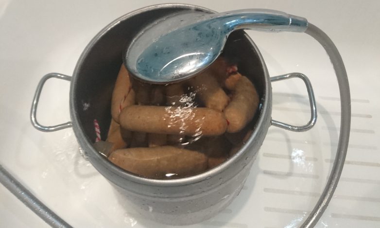 На следующее утро приступаю к варке. Так как сосиски не толстые (2 см в диаметре) их удобно варить методом «2 кипятка». Заливаем их кипятком на 15 минут, затем воду надо слить, и снова залить кипятком на 15 минут. Готово.