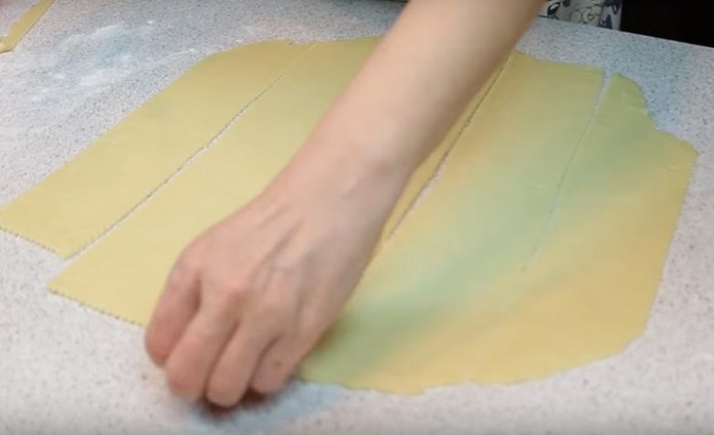 Достань шарики из холодильника и раскатай каждый до получения полоски длиной 20–25 см и шириной 3–4 см.