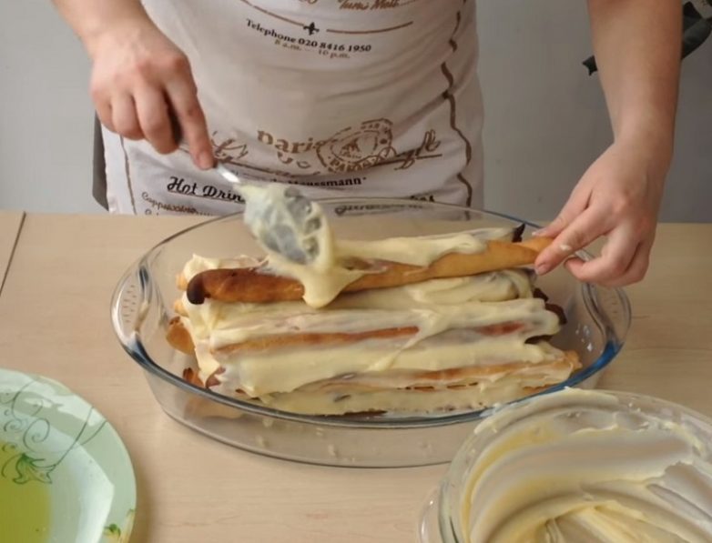 Осталось сделать крем. Выложи сметану на марлю, которой покрыт дуршлаг, и оставь на 5–6 часов в холодном месте, чтобы отошла лишняя сыворотка.Подготовленную сметану взбей с сахаром.Возьми большое блюдо и смажь его дно кремом. Теперь можно заняться постройкой избы. Уложи первый слой из 7 «бревен» с разной начинкой и смажь кремом. Следующий слой будет состоять из 6 «бревен», следующий на одну трубочку меньше — и так до тех пор, пока «бревна» не закончатся.