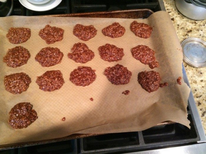 Добавьте арахисовое масло или ореховую пасту, ванилин и хлопья. Хорошенько всё перемешайте и ложкой распределите «печеньки» по пергаменту для запекания.