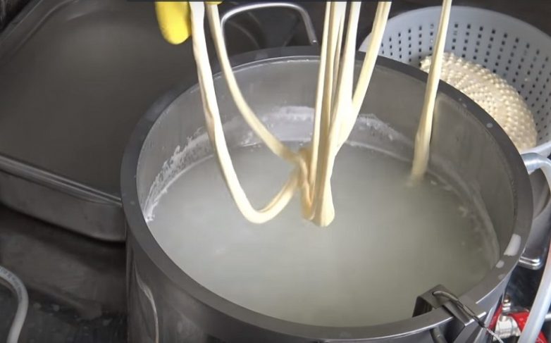 Постепенно переходи от вымешивания к растягиванию сыра и формированию нитей. Когда нити сыра приобретут нужную форму, опусти их в предварительно подготовленную соленую воду комнатной температуры. На литр такой воды потребуется 200 г соли.
