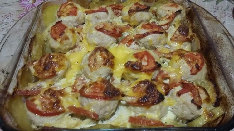 Порезать помидор на пополам, потом каждую половинку на пополам и порезать тоненькими дольками.Уложить сверху котлеток и в промежутках между ними. Смешать яйца и сметану полить этой смесью ( т.к в семье маленький ребенок я делаю именно так, но можно воспользоваться майонезом)Посыпать тертым сыром. Закрыть фольгой и в духовку на 30 минут.