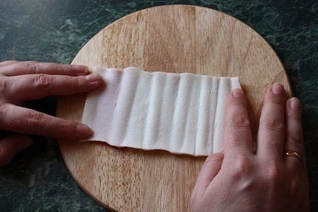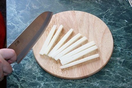 Режем сыр полосочками. Разворачиваем палочки. Теперь кладём сыр и заворачиваем обратно.