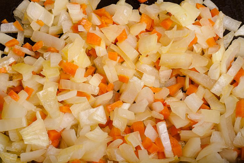 Режем лук и морковь и закидываем на сковородку с оливковым маслом на небольшой огонь. Обжариваем до мягкости.