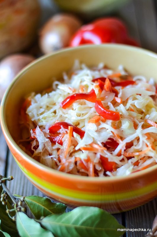 Очень вкусная, хрустящая капуста с луком, морковью и красным болгарским перцем — отличная овощная закуска. Маринад придаёт ей насыщенный пикантный вкус, а набор овощей обеспечит вас витаминами!