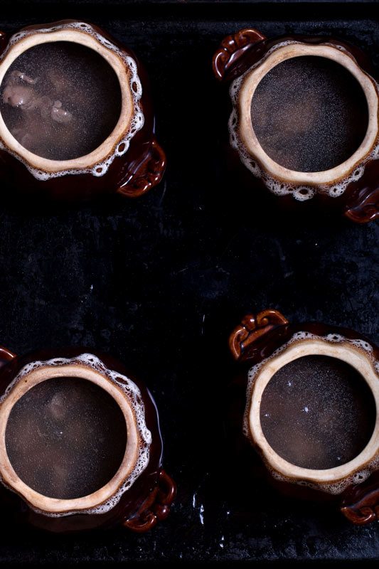 Ставим в духовку.Через 15 минут достаем, кидаем в горшки по три-пять горошен черного перца и по листику лаврового листа, и ставим еще на 10 минут.