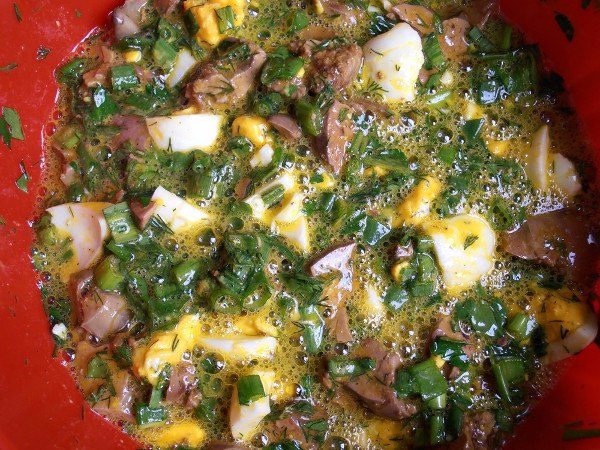 Сырые яйца взбиваем в миске вилкой, добавляем к зелени, печени, вареным яйцам и аккуратно перемешиваем.
