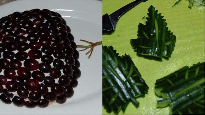 Переходим к финальному шагу — украшения салата. Для этого аккуратно выкладываем половинки винограда. А после этого, по такому же принципу, как на фото, вырезаем ножом листики из огурца.