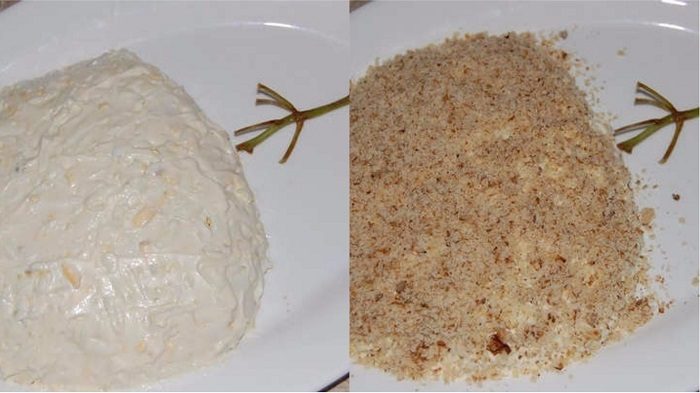 Перемазываем майонезом, а затем обильно посыпаем грецкими орехами.