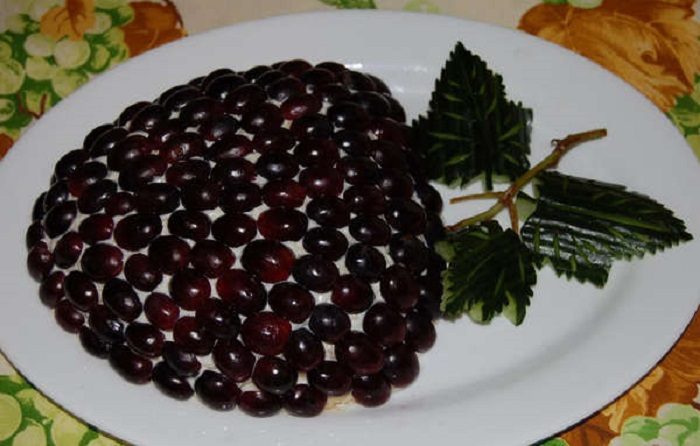 От грозди винограда возьми подходящею веточку. В первом слое мы укладываем куриную грудку.