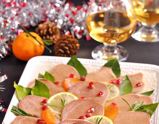 Язык нарезать на кусочки, выложить в блюдо, украсить по желанию и залить желейным бульоном комнатной температуры так, чтобы весь язык оказался под бульоном, иначе до следующего дня не залитые края могут подсохнуть. Убрать заливное в холодильник до полного застывания.