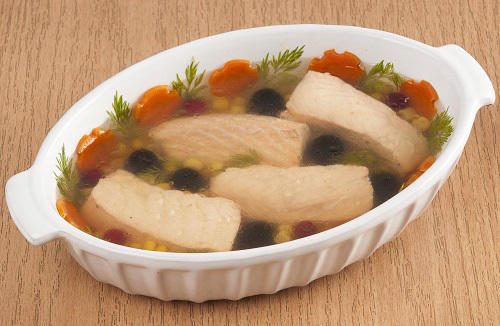 Лук и морковь вымыть, очистить, нарезать крупными ломтями. Филе рыбы вымыть, выложить вместе с овощами в холодную воду, посолить и отварить на слабом огне в течение 20 минут. Рыбу и овощи аккуратно вынуть шумовкой на тарелку. Бульон процедить через марлю.Отлить 1 стакан бульона, развести в нем желатин и дать набухнуть в течение 30 мин. Кукурузу выложить на сито, дать жидкости стечь.Рыбу нарезать порционными кусками, морковь – кружочками. Выложить рыбу и морковь в форму. Туда же выложить кукурузу, клюкву и маслины.Набухший желатин нагреть на слабом огне, помешивая, до полного растворения. Процедить и влить в бульон.Залить продукты в форме бульоном, добавить зелень укропа и поставить заливное в холодильник на 1–1,5 часа для застывания.