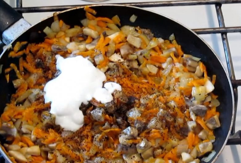 Добавь соль, перец и сметану. Перемешай и туши до готовности.