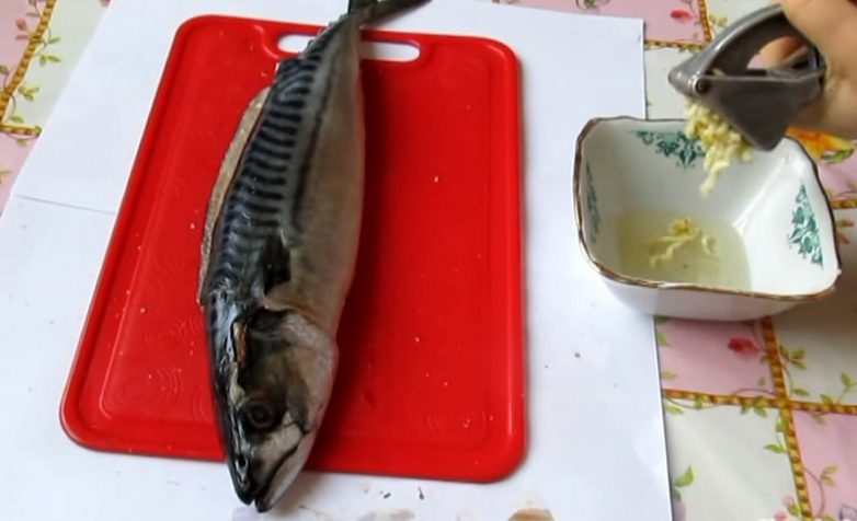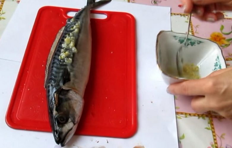 С другой стороны спинного плавника сделай еще один надрез параллельно первому. В результате хребет будет отделен от филейной части. Перережь хребет у головы и хвоста, удали его.Аккуратно удали внутренности, реберные кости и жабры, соскреби черную пленку.Полей скумбрию лимонным соком, посоли и поперчи.Приготовь из растительного масла, соли и измельченного чеснока маринад.