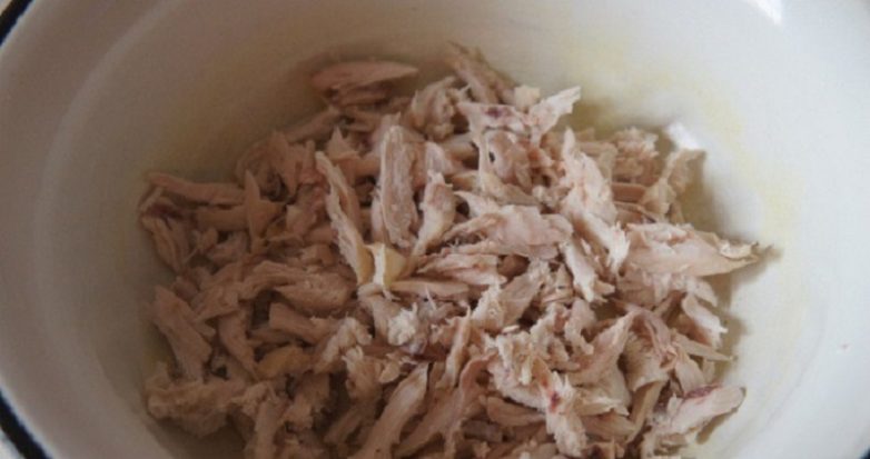 Нарежь курицу небольшими кубиками или порви на волокна. Выложи в глубокую миску.