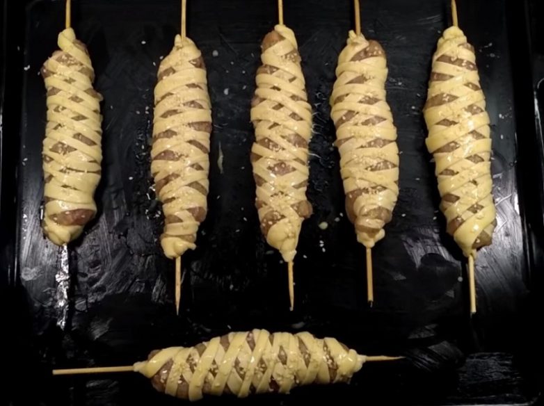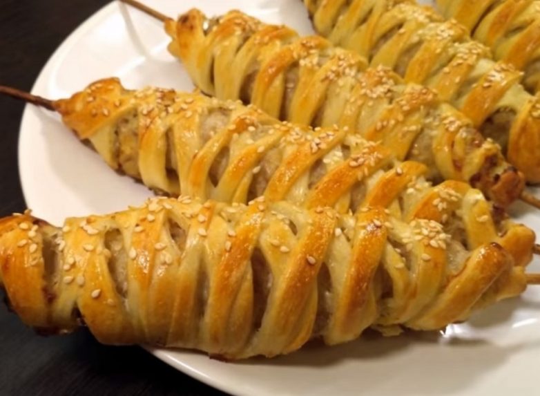 Нарежь слоеное тесто полосками по 2 см шириной.Обмотай каждый люля-кебаб двумя полосками теста. При желании поверхность теста можно покрыть яичным желтком и присыпать зернами кунжута.