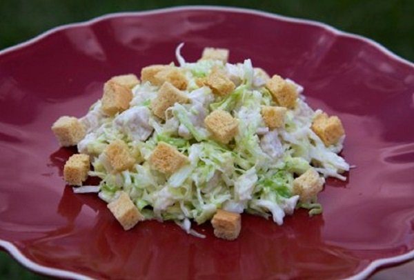 Довольно оригинальные и в то же время простые салаты на Новый год 2018 Собаки можно приготовить с сухариками. Например, в основе нашего варианта такого необычного салатика курица и капуста. И именно добавление сухариков в этот микс придает блюду нового интересного вкусового звучания.