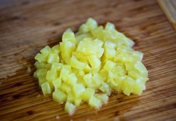 С консервированных ананасов сливаем сок. Затем стараемся нарезать их такими же небольшими и аккуратными кубиками, как ветчину. Это необязательное условие, то так салат получится не только вкусным, но еще и красивым.