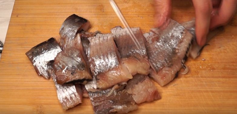 Нарежь филе сельди кусочками. Затем положи рыбу в блендер и добавь в емкость еще одну нарезанную луковицу. Измельчи все ингредиенты до однородной консистенции.