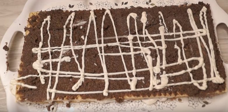 Повтори комбинацию из трех слоев еще раз. Затем обильно смажь бока и верх торта майонезом. Помести готовое блюдо в холодильник на 3 часа.