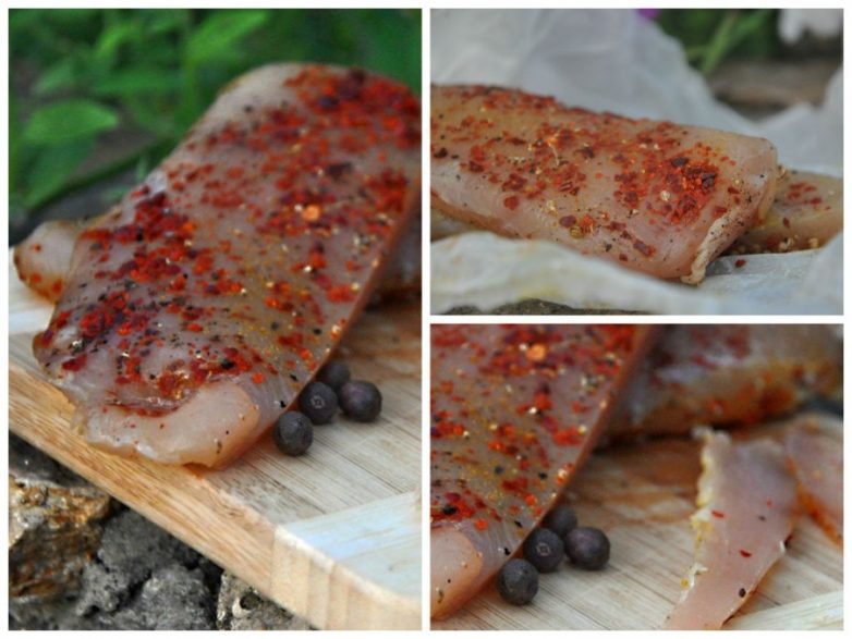 Для начала хорошо промываем куриное филе под проточной теплой водой. Вытираем насухо бумажными полотенцами. Готовим смесь из специй. В пиалу высыпаем соль, черный молотый перец и красный молотый перец (еще добавила зерна кориандра и кусочки паприки). Выливаем в емкость коньяк и, воспользовавшись столовой ложкой, хорошо перемешиваем все компоненты до образования однородной массы. Внимание: как со спиртным, так и без него куриная грудка получается сочная и очень вкусная, поэтому добавляйте коньяк по вкусу. Выкладываем куски куриного филе в глубокую миску и тщательно натираем мясо со всех сторон смесью специй. Обматываем хорошо емкость с блюдом пищевой пленкой и ставим в холодильник на 48 часов.