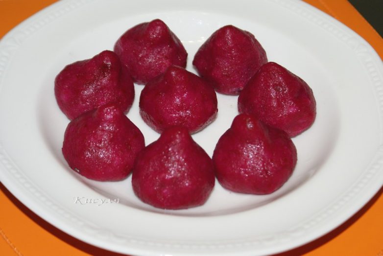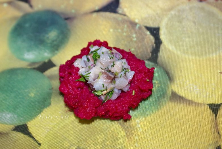 Из свекольно-картофельной массы сделать небольшую лепёшечку, в середину поместить чайную ложку селёдочной начинки, сформировать «пирожок» в виде клубнички.