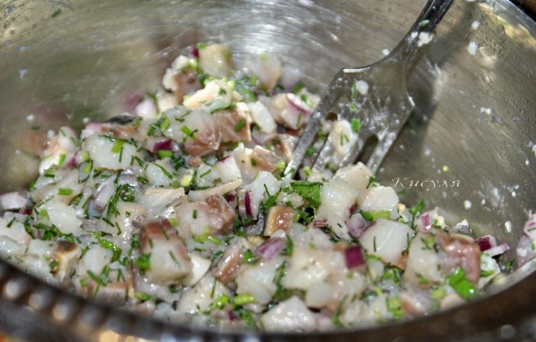 Сельдь, крутое яйцо и лук нарезать мелкими кубиками, смешать с измельчённой зеленью укропа.