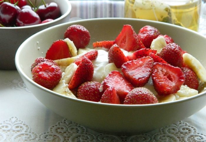 100 грамм творога, 2 ложки натурального йогурта или сметаны, немного сезонных фруктов и сытный, вкусны, а главное полезный завтрак готов. В зимний период свежие фрукты можно заменить на замороженные, а для вкуса добавить пару чайных ложек джема или меда.