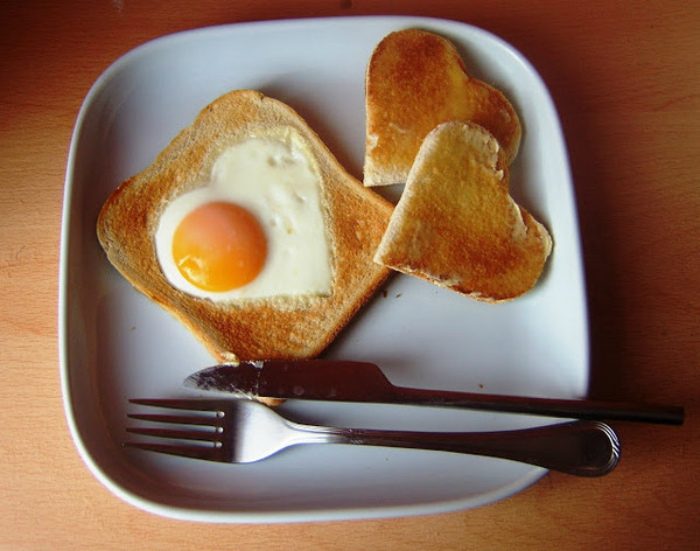 Еще один оригинальный способ приготовления яичницы. Возьмите ломтик хлеба для тостов, вырежьте в центре сердечко, извлеките мякиш, положите на разогретую сковородку и обжарьте с двух сторон. В серединку тоста аккуратно разбейте яйцо.