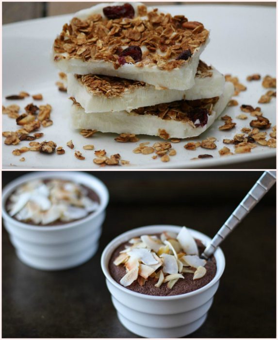 Поллитра натурального йогурта без добавок смешайте с медом и кокосовой стружкой. Полученную массу разлейте в формочки и поставьте в морозилку. Через пару часов десерт готов к употреблению. Перед подачей посыпьте его тертым шоколадом и хлопьями.