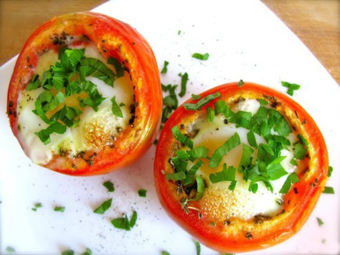 Отличнаый вариант летнего завтрака, который можно приготовить за 15 минут из помидора, яйца, ветчины и сыра. Для начала возьмите большой помидор, вырежьте его сердцевину, внутрь положите немного измельченной ветчины, разбейте яйцо, добавьте зелень и специи, сверху посыпьте тертым сыром. Начиненный помидор отправьте в духовку и выпекайте при температуре 180 градусов 10 минут.