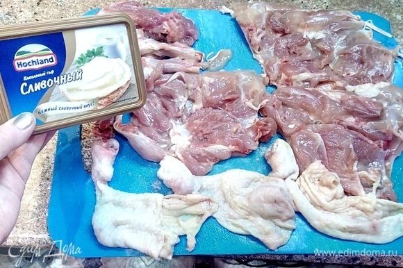 Пока обжариваются окорочка, отбиваем филе окорочков, подготавливая их к изготовлению рулета.