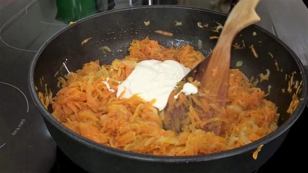 В протушенные овощи добавляем 2 ст. ложки сметаны, перемешиваем и немного прогреваем. Количество сметаны должно быть таким, чтобы начинка не стала жидкой, поэтому необходимо определять на глаз. Больше 2 ст. ложек добавлять не стоит.