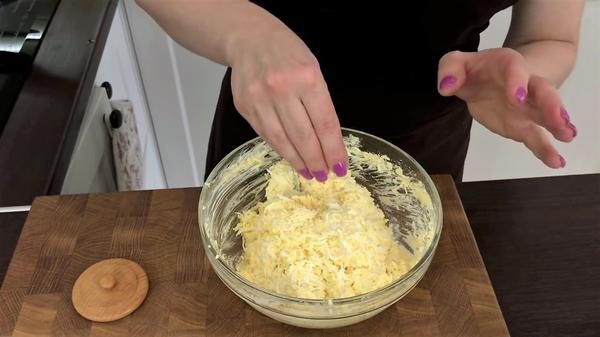 Сваренные вкрутую яйца натираем на мелкой тёрке. Хорошо получится, если вы будете чередовать их с чесноком, тогда масса получится однородная. Также можно использовать для измельчения чеснока пресс, а затем всё хорошенько перемешать.